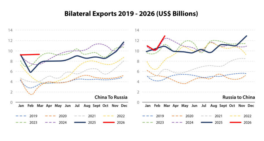 Trade turnover between Russia and China in the first quarter of 2026 has exceeded US$61 billion, rebounding by 14.8% or almost US$8 billion more than a year earlier, according to Chinese customs statistics. Russia imports of Chinese goods in January–March increased by 22% year-on-year to reach US$27.7 billion, while Russian exports to China grew by 9% to US$33.6 billion.