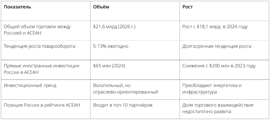 Со статистической точки зрения Таиланд представляет собой партнера “среднего уровня”, который не является ни доминирующим, ни незначительным, но обладает значимым потенциалом роста. Ожидается, что по мере расширения сотрудничества между АСЕАН и Россией в рамках разрабатываемого Плана действий на 2026–2030 годы Таиланд будет играть более активную роль в налаживании экономического и институционального взаимодействия.