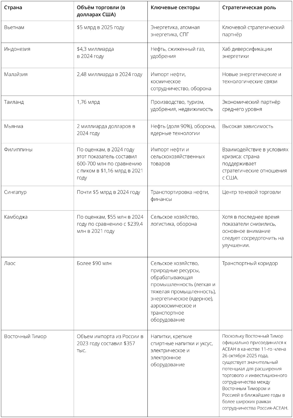 Для стран АСЕАН переход на российские энергоносители обусловлен как необходимостью, так и прагматизмом. Правительства стран региона подчёркивают, что обеспечение стабильных и доступных поставок энергоносителей отвечает «национальным интересам», несмотря на сложную геополитическую ситуацию. В результате наблюдается заметный рост поставок российской нефти в регион, а также заключение новых соглашений в области сжиженного природного газа (СПГ), развития нефтеперерабатывающих заводов и сотрудничества в сфере атомной энергетики. Эти тенденции свидетельствуют о том, что энергетика — это не только краткосрочное решение проблемы в кризисной ситуации, но и долгосрочная основа для укрепления экономических связей.
