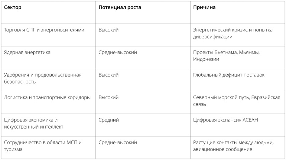 В то время как энергетика доминирует в отношениях, другие отрасли приобретают все большее значение. Россия предложила расширить сотрудничество в области цифровой трансформации, искусственного интеллекта, кибербезопасности и развития «умных городов» в рамках предстоящего Плана действий Россия-АСЕАН (2026-2030). Эти области соответствуют долгосрочным приоритетам АСЕАН в области развития и открывают возможности для диверсификации, выходящей за рамки торговли ресурсами.