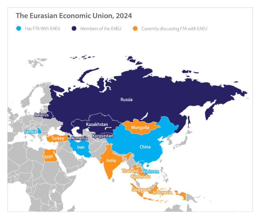 ЕАЭС занимает географическое пространство между Восточной Европой и Западным Китаем. В течение последних двух лет наблюдался значительный рост транзита товаров и цепочек поставок, поскольку Россия повернулась на восток, удаляясь от Европы в своем импорте и экспорте.